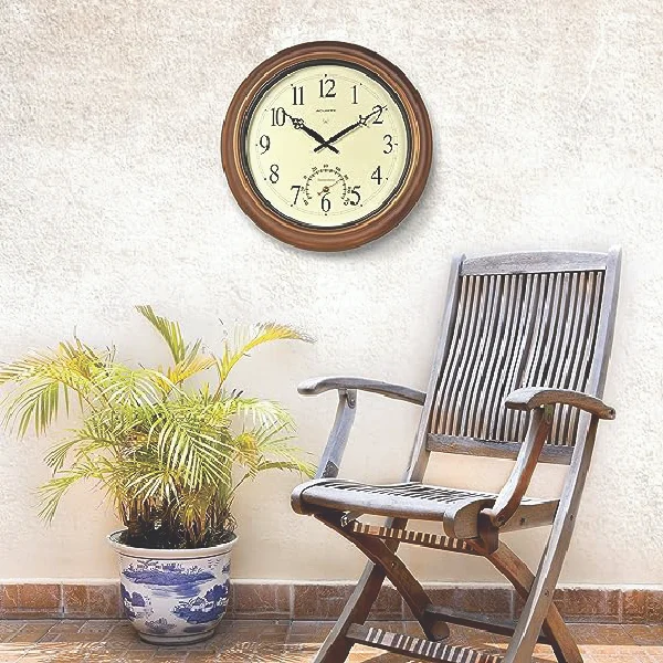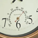 A stately wall clock for indoors and out, this 18-inch copper clock from Chaney Instruments dresses up any living room, patio or porch. A weather-resistant copper finish and solid metal construction ensure years of outdoor use. The Atomic Clock sets itself automatically for perfect time-even for Daylight Savings Time switches.