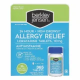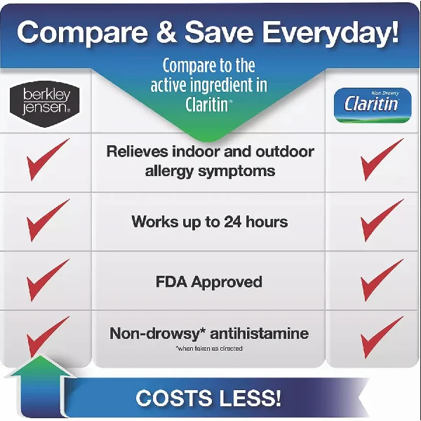 Original prescription strength: get strong symptom relief without sleepiness, when taken as directed. This trusted allergy medicine comes in full prescription strength. Antihistamine: this histamine blocker temporarily relieves symptoms due to heavy fever or other upper respiratory allergies like the runny nose, itchy, watery eyes, sneezing, itching of the nose or throat. Non-drowsy: when taken as directed, this allergy medicine will help your runny nose and other common allergy symptoms without making you feel drowsy. Includes 10mg Berkley Jensen allergy relief loratadine tablets. Compare to Claritin tablets active ingredient. With non-drowsy allergy relief from loratadine tablets 10mg, you can stop sniffling and enjoy spring without the dreaded symptoms of seasonal allergies. Pet dander, mold, or dust? No problem. One dose provides all-day, 24-hour relief of sneezing, runny nose, itchy or watery eyes, and itchy throat or nose from indoor or outdoor allergens.