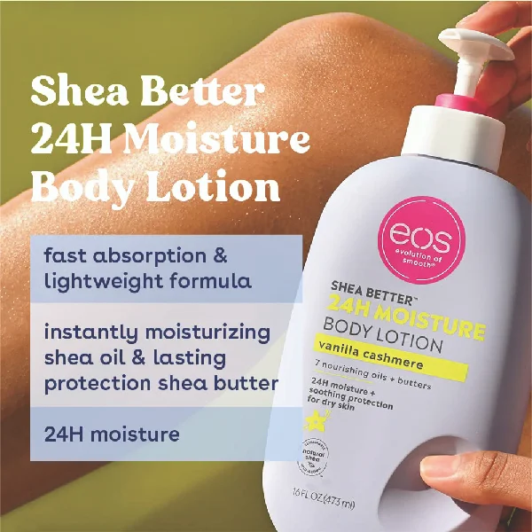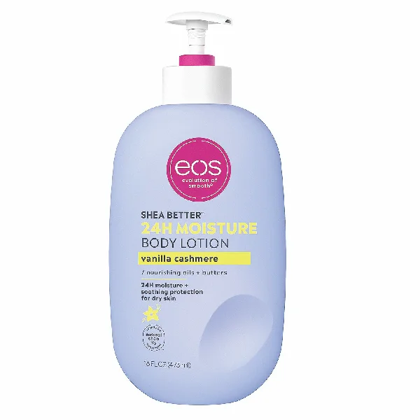 SHEA BETTER BODY LOTION: Our sweet and nuzzly Vanilla Cashmere scent contains fragrance notes of whipped vanilla, soft musk and cozy caramel. eos 24-hour hydration body lotion is made with natural ingredients to leave your skin smooth from head-to-toe. 24-HOUR MOISTURE FOR YOUR BODY: Soothe and protect your skin with our lightweight and non-greasy lotion. No sticky residue or heaviness, just all-day hydration and smooth skin. SMOOTH ON: Apply this fast-absorbing and deliciously scented body lotion to just-cleaned skin, paying special attention to dry, rough areas. Relax – we’ll do the rest. SUSTAINABLE SKIN CARE: Protect and moisturize your skin with 7 nourishing oils + butters, including natural shea butter and shea oil. Our collection of incredible fragrances will delight in application and last all day on skin. ALL-NATURAL SHEA BUTTER: eos products have wild grown, sustainably-sourced 100% natural shea butter to make skin feel moisturized, protected and soft. We are paraben, phthalate and gluten free. Dermatologist tested. Vegan. Hypoallergenic. PETA certified. No products tested on animals.