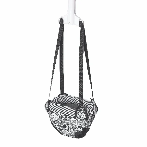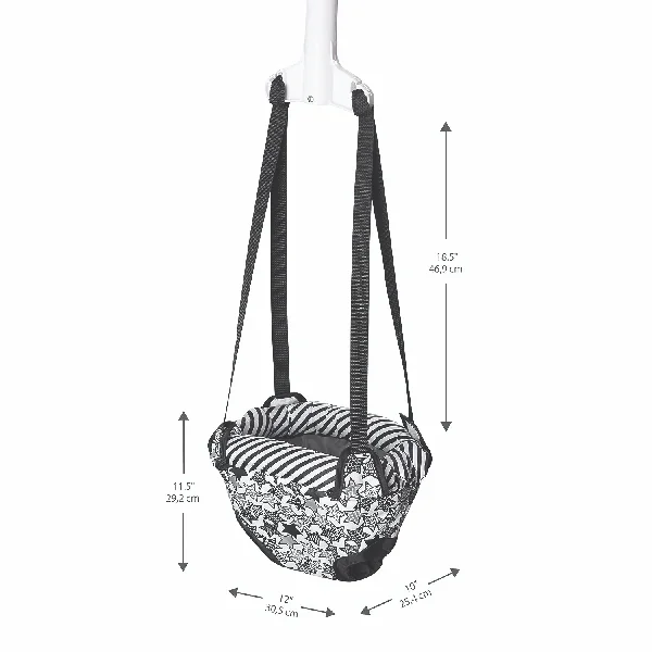 The ExerSaucer Door Jumper delivers jump after jump of excitement for your little one. Jumping helps build core muscle development, while providing entertainment and exercise, without taking up floor space. The easy-to-use clamp makes moving the jumper from room to room a breeze, and the adjustable straps mean you can customize the height for your child. Because setup is quick and doesn’t require tools, this item is perfect to throw in a travel bag for day trips or vacations. The soft fabrics are wipeable and machine-washable, a convenience you’ll love.