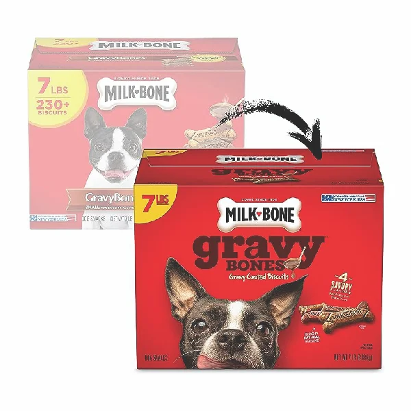 Milk-Bone GravyBones dog biscuits feature the same vitamin-fortified goodness of Milk-Bone Original dog snacks in 4 delicious, gravy-basted varieties your dog will love: beef, chicken, bacon and liver flavors. These tasty dog treats are prepared with care in Buffalo, New York, USA, using only natural ingredients as sources of color. Better yet, the crunchy texture of Milk-Bone dog biscuits helps freshen dogs′ breath and reduce tartar build-up. So you can not only feel good about the wholesome goodness you′re giving your doggo; you can also fully enjoy all the grateful, sloppy kisses that are sure to come your way. Win-win.