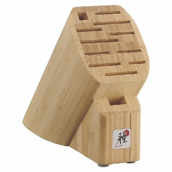 Stay organized while maximizing counter space. The MIYABI 12-slot Bamboo Knife Block holds up to 10 knives with extra slots for a pair of scissors and a sharpening steel. Keep all your kitchen essentials within reach for fast, efficient prep work.