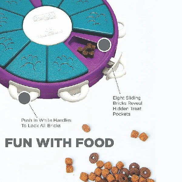 When you’re looking for a toy for bored dogs who have mastered the simpler dog treat puzzles, this engaging level 3 advanced interactive treat puzzle from Nina Ottosson by Outward Hound is the perfect next step! The Dog Twister interactive dog puzzle toy features nine treat drawers for dog treats which are secured in place with nine white tabs. Just simply place the treats in the drawers, slide them in, and lock the white drawer tabs for an added sequential step challenge.