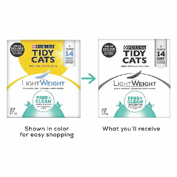 Keep your cats’ litter boxes tidy with Purina Tidy Cats LightWeight Free and Clean Unscented With Ammonia Blocker clumping multi cat litter. This unscented cat litter is free from fragrances and dyes, and the low-dust composition means it pours easily and cleanly into the litter box. Activated charcoal in the clay cat litter absorbs odors on contact, while an Ammonia Blocker prevents ammonia odor from forming for 14 days when used as directed.
