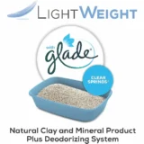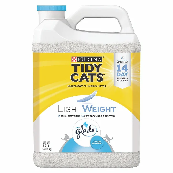 Two (2) 8.5 lb. Jugs – Purina Tidy Cats Low Dust Clumping Cat Litter, LightWeight Glade Clear Springs Multi Cat Litter. Tidy Cats LightWeight kitty litter prevents ammonia odor from forming for 14 days when used as directed. Lightweight litter formula is 50 percent lighter than the leading clumping multi cat litter and is easy to carry, pour and store for less weight, not less litter. Low dust cat litter enables a clean, easy pour and forms tight, light clumps for easy scooping. Clay clumping cat litter features Glade Clear Springs scent that keeps your cats’ litter box area smelling fresh while locking in moisture to keep them dry and comfortable