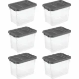 Pack of 6 Sterilite latch clip storage bins are the perfect size for boots, accessories, small household tools, and supplies. Durable and safe storage solution made of sturdy plastic materials that is ideal for garages, basements, attics, sheds, and more. Robust latches ensure the lid will stay attach to the base offering extra security, and the textured surface makes for a sure grip when carrying. Deep indexed lid surface allows multiple totes to stack securely. The clear bases make it easy to see what’s inside without having to open them up