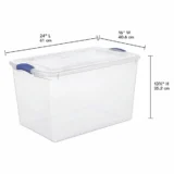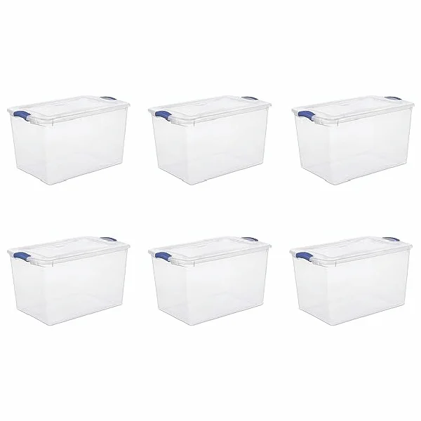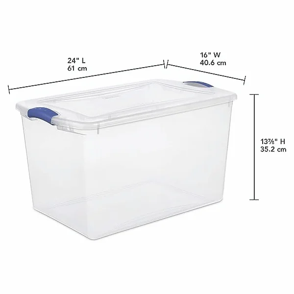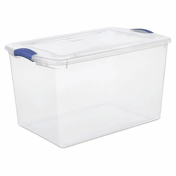 About this item Wondering how to de-clutter your home and organize? The Sterilite 66 qt Latch Box is a great way to sort, organize and store almost anything. From clothing to books and magazines to craft supplies and toys, these latch boxes provide secure dirt and moisture proof storage for anything you’d like to store and protect. Get the kids involved and straighten any room in the house with the help of these Blue Eclipse Tote Boxes. Store extra ites in the basement, garage, bedrooms, the playroom and more.